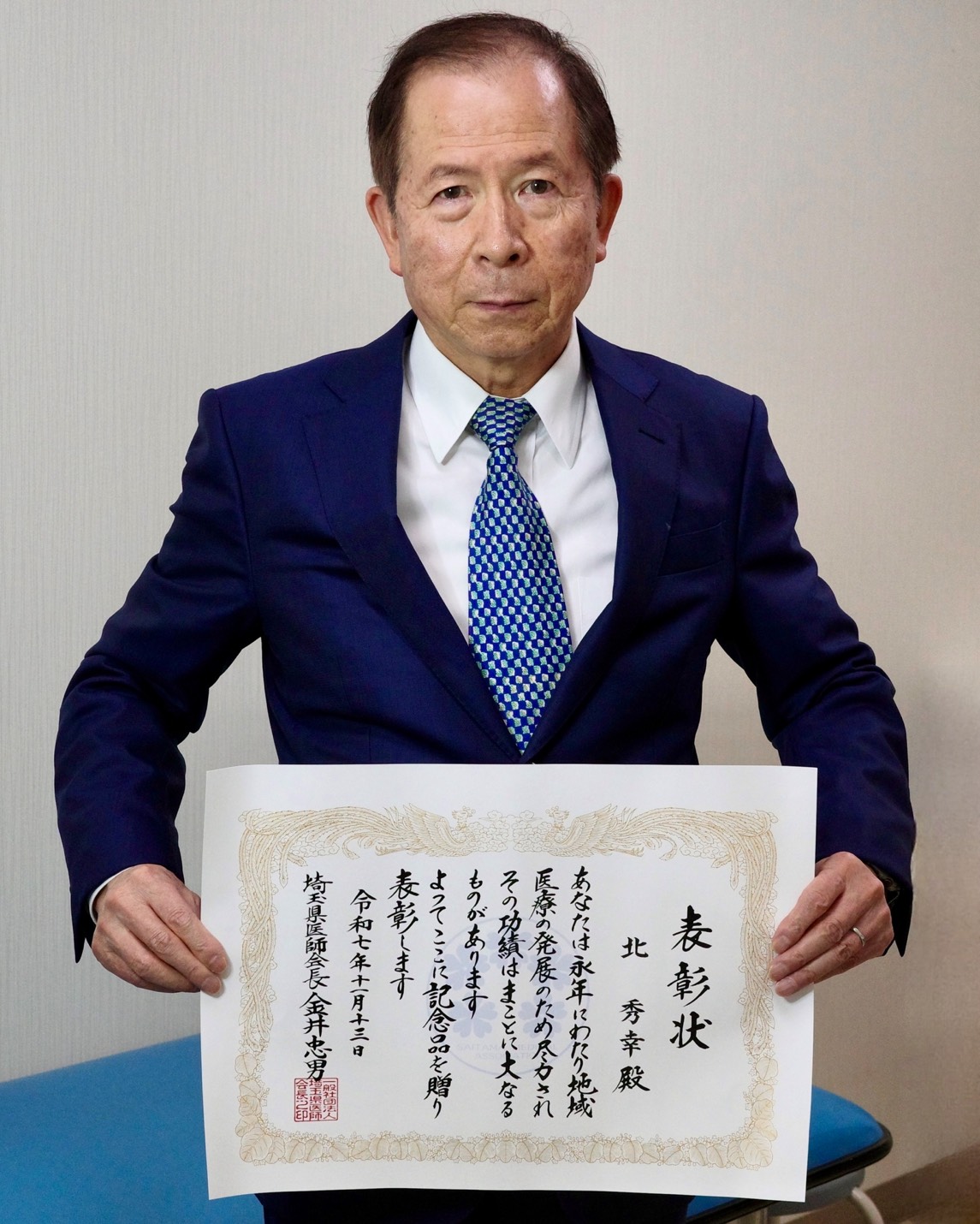 2025年11月13日(木)、埼玉県県民健康センターにて開催された『第78回 埼玉県医師会創立記念表彰式』において、当院 名誉院長 北 秀幸 が表彰されました。