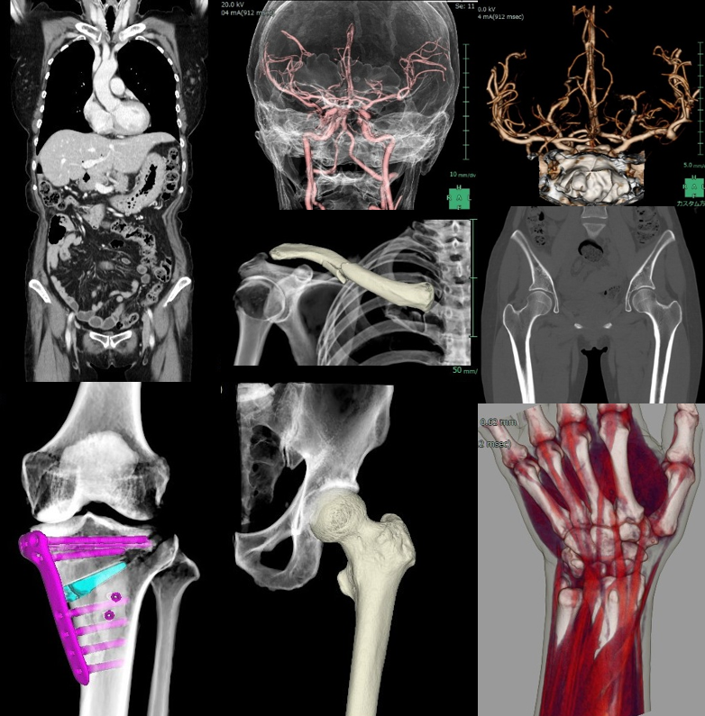 当院では、2025年5月に最新の64列マルチスライスCTを導入しました。CT(Computed Tomography)装置はX線を用いて体の断面を撮影する検査機器で、頭頚部、胸部、腹部、四肢など全身の検査に対応しています。特に、胸部では大動脈や気管支、肺、腹部では肝臓や腎臓などの病変の描出に優れています。当院では、全身領域の検査を実施しており、高度な画像処理により任意の断面や立体的な3D画像を作成することが可能です。そのため、病変の診断だけでなく、手術計画や治療方針の決定にも役立っています。