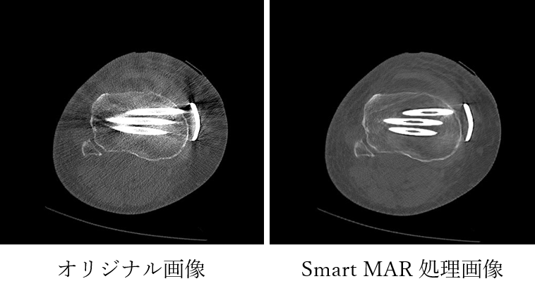 当院の64列マルチスライスCTは、天井に設置されたAIカメラにより、患者さま一人ひとりに最適なポジショニングを自動で計画し、最も効果的なCT検査を実現します。また、最新のフルデジタル検出器と逐次近似再構成(ASiR-V)を搭載しており、従来のCTと比べて被ばく線量を大幅に低減することが可能です。さらに、目の水晶体など放射線の影響を受けやすい臓器には、正面方向からの直接被ばくを40%軽減するODM(Organ Dose Modulation)機能を備え、安全性にも配慮しています。加えて、従来CTでは体内金属によるアーチファクト(画像の乱れ)が診断の妨げになることがありましたが、SMART MAR(金属アーチファクト低減)機能により、インプラントやクリップ、プレートなどの周囲でもアーチファクトを低減し、より診断能の高い画像を提供できるようになりました。
