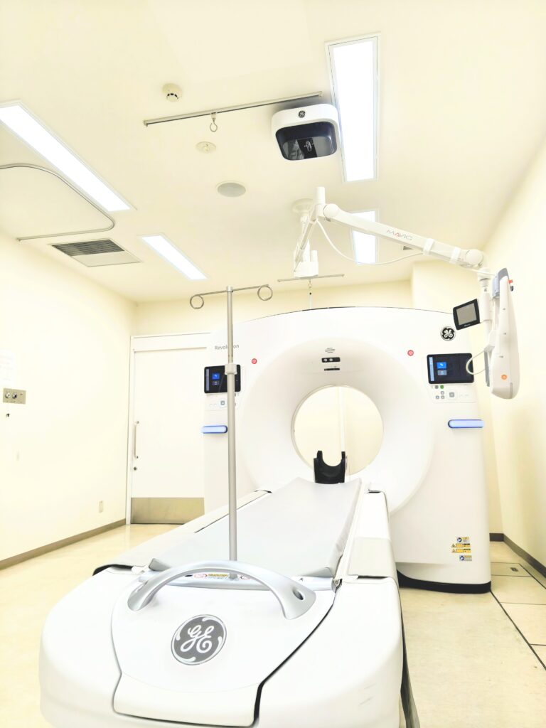当院ではGE社製の64列マルチスライスCTを導入しています。被ばく低減可能な逐次近似画像構成法ASiR-VソフトウェアやAI技術を駆使した次世代ワークフローを搭載した最新のCTで検査が行えます。