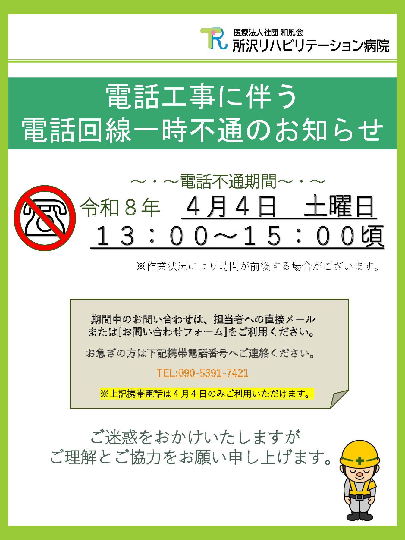 □不通日時:令和8年4月4日土曜日 13:00~15:00