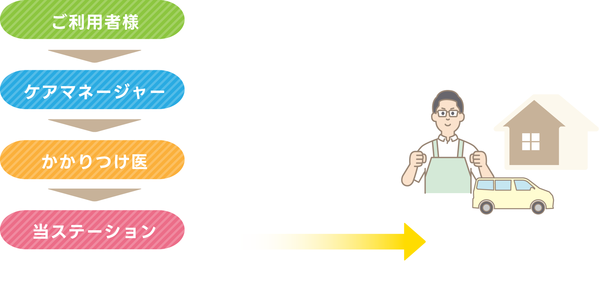 ケアマネージャーや主治医を通しての依頼が主となりますが、直接の電話や面接の相談にも対応しています。